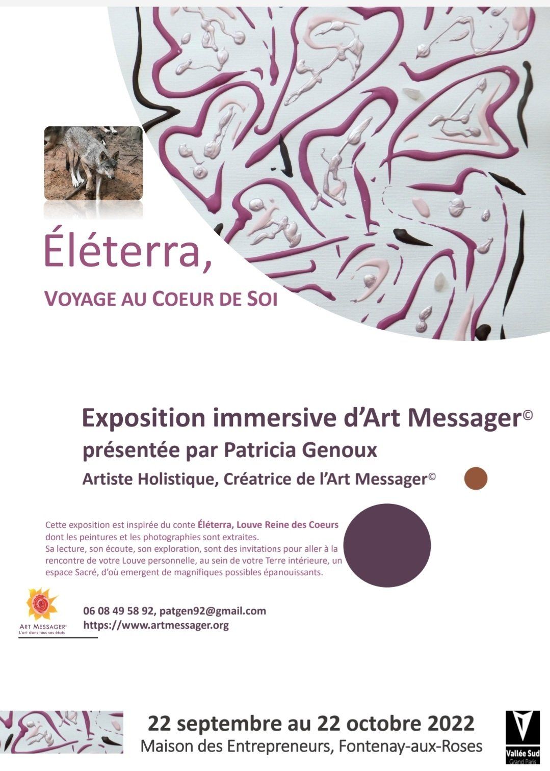 Exposition immersive ELETERRA, VOYAGE AU CŒUR DE SOI. Présentation de 8 photographies et de 4 toiles messagères du livre Eléterra, Louve Reine des Cœurs.